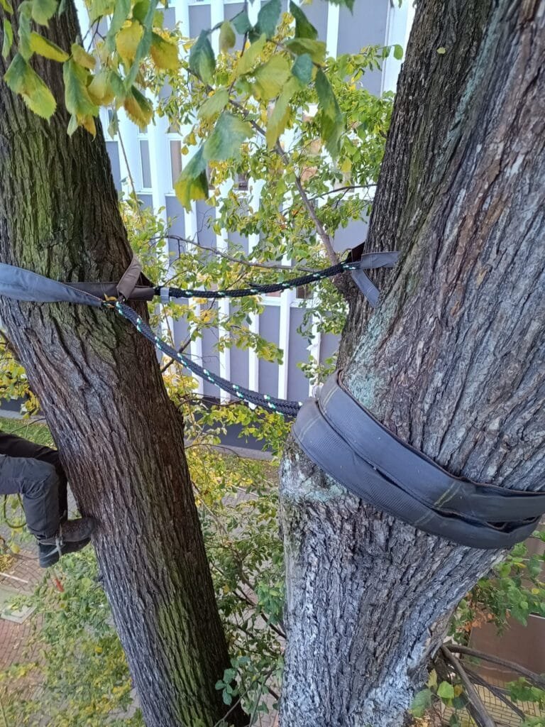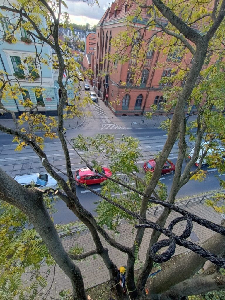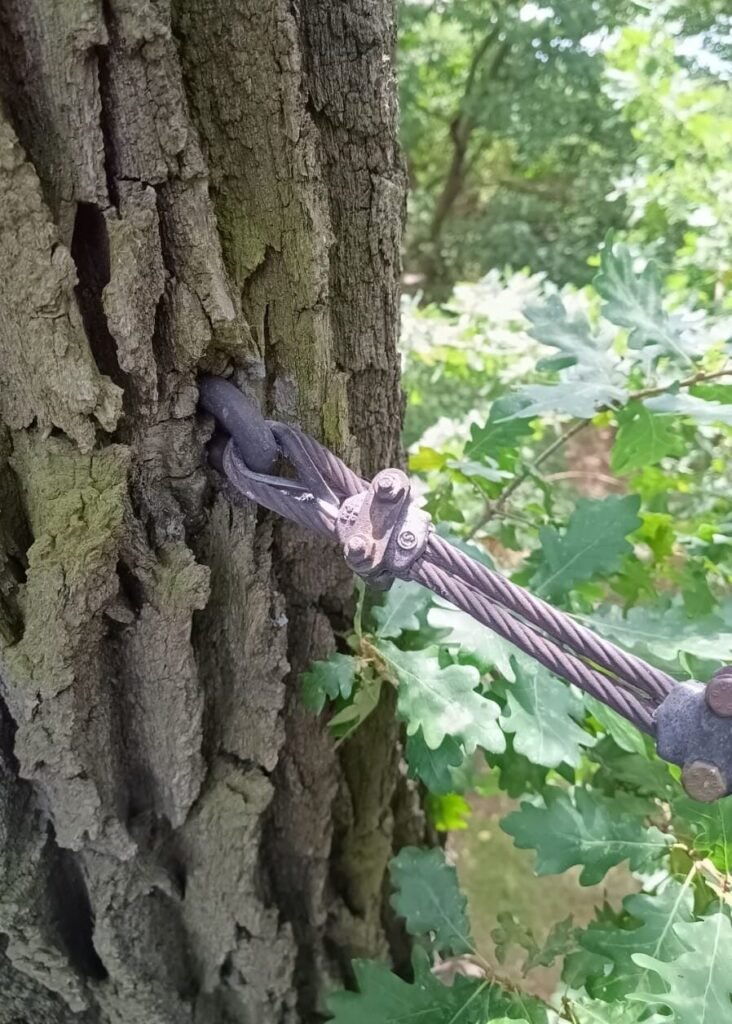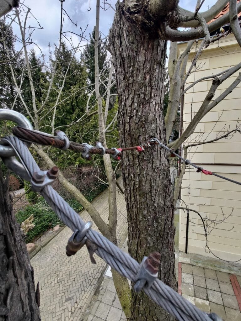 Należy także pamiętać, że sposób montażu ma zapewnić także zabezpieczenie pnia/konaru przed upadkiem na ziemię w sytuacji, gdy jednak dojdzie do wyłamania. Jest to element często pomijany w projekcie wiązań.