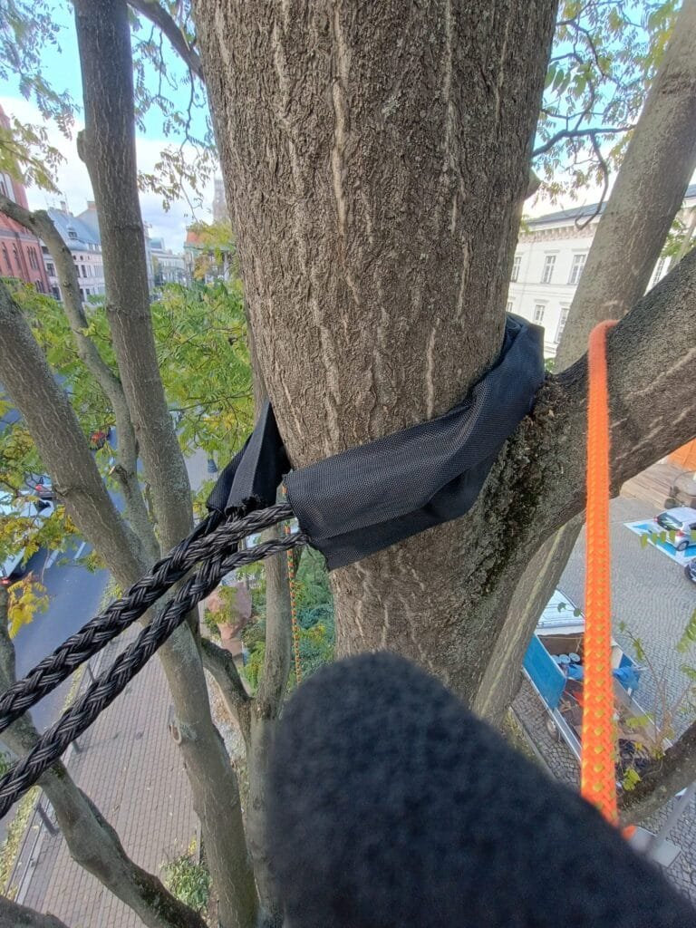 Konieczne jest także zapobiegnięcie uszkadzania drzewa przez liny. W tym celu stosuje się osłony (taśmy rurowe), które nawleka się na linę i umieszcza w miejscu styku z tkankami. GEFA/Drayer dostarczają odpowiednie produkty, wykonane z grubego materiału od wewnętrznej strony, a w systemie Cobra/BOA w linę wplata się specjalne usztywniacze, które zwiększają powierzchnię styku z tkankami (zmniejszając nacisk jednostkowy). Osłony, podobnie jak liny, powinny odznaczać się wytrzymałością na warunki atmosferyczne, aby zachowywały swoje funkcje przez cały okres użytkowania wiązania.